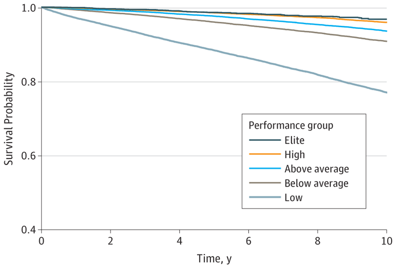 The study found that having Low cardiorespiratory fitness carried a higher risk of death than smoking, diabetes, or heart disease combined. Conversely, those with "Elite" fitness (top 2.5% for their age/sex) had a 5x lower risk of death than those in the lowest group.