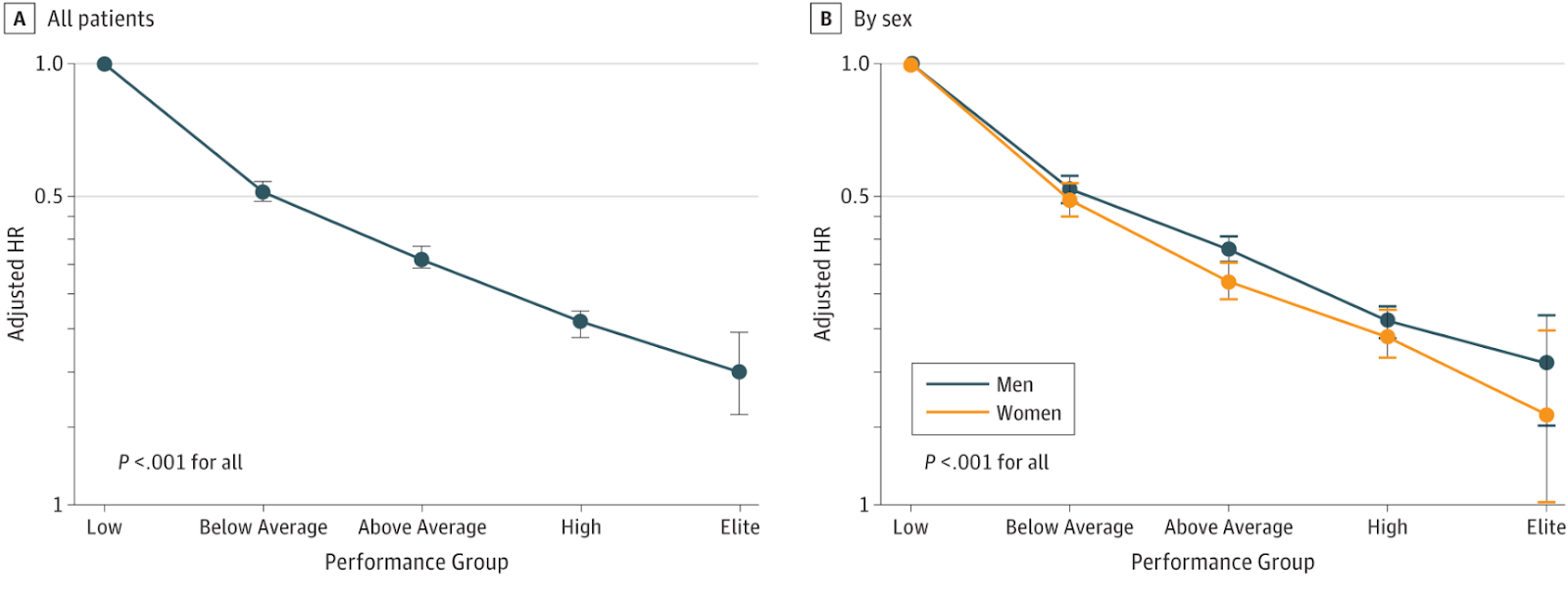 What this shows: The chart should demonstrate a dramatic, stepwise drop in mortality risk as fitness increases. The "Elite" group (top 2.5%) has roughly a 5x lower risk of death compared to the "Low" group (bottom 25%). Crucially, there is no upper limit; being "elite" is better than being just "high."